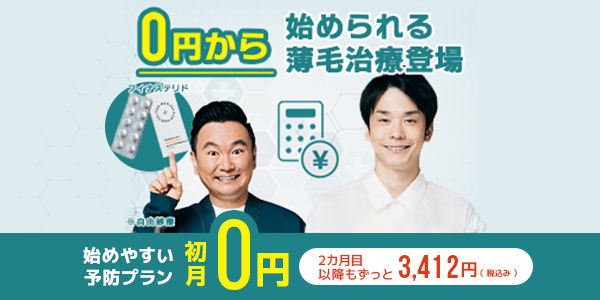 | AGA治療薬の料金 | ■予防プラン 初回:0円※1 2回目以降:3,412円(税込)~ 抜け毛を防ぐフィナステリドを処方するプラン |
