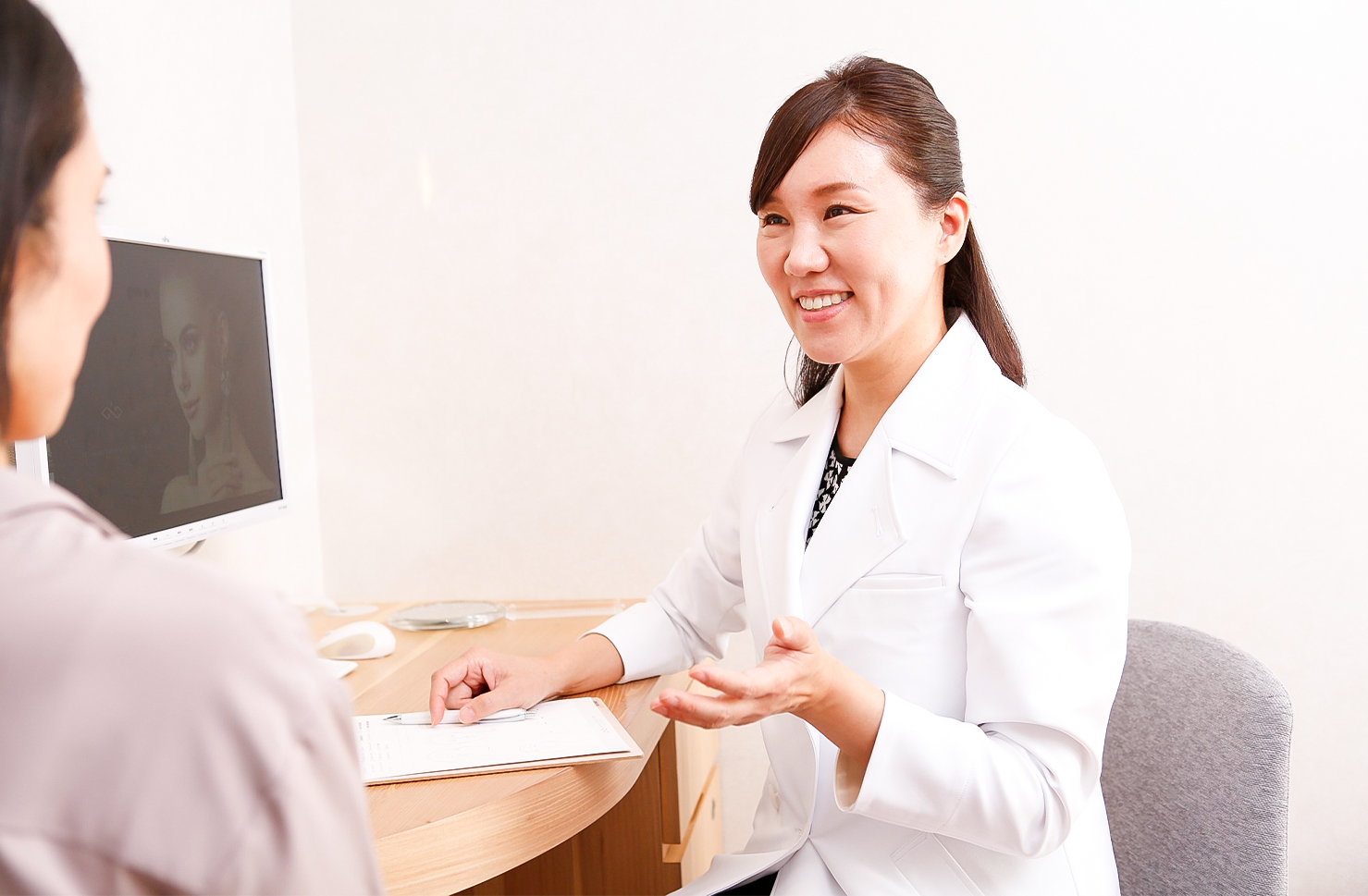 医師の説明といっても専門的な言葉はできるだけ使わずに分かりやすい解説を心がけており、また実際にご提案する施術についても痛みなどが少なくて肌にも優しいメニューを中心としておりますので、おそらく皆様が美容医療や美容外科に対してイメージされているものよりもっと身近でマイルドで、とても自然であることに驚かれることでしょう。